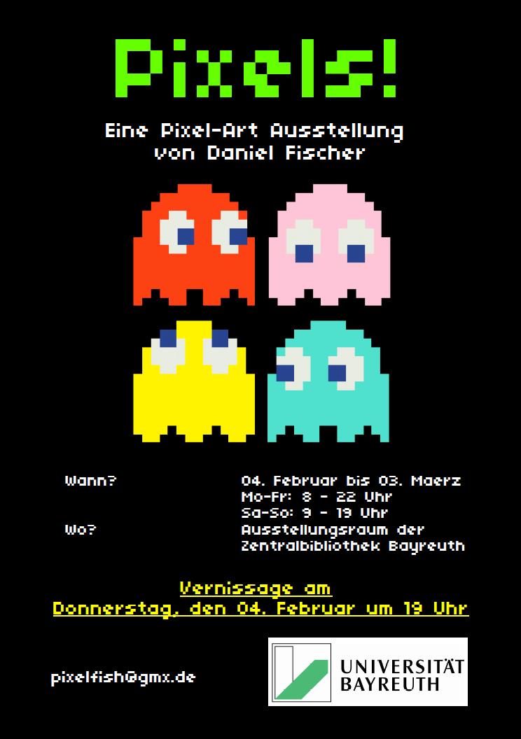 Die Ausstellung Pixels! von Daniel Fischer beschäftigt sich mit der Verbindung zweier gänzlich fremder Medien: Der Computergrafik und der bildenden Kunst. Während in der bildenden Kunst Motive durch freie und oftmals unkonventionell geführte Pinselstriche auf die Leinwand gebannt werden, entstehen Grafiken auf dem Monitor durch eine äußerst lineare und mathematische Methode. Mithilfe einer Vielzahl von quadratischen Bildpunkten, den sogenannten Pixeln, entstehen Kunstwerke die ihre kantigen Bestandteile meist komplett vergessen lassen.
